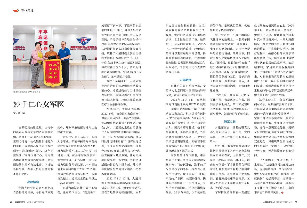 据悉,《中国退役军人》杂志由退役军人事务部主管,是聚焦退役军人先进事迹、展现退役军人时代风貌、传递尊崇关爱温度的核心权威期刊,更是全国退役军人的精神家园与宣传阵地。此次荣登《中国退役军人》杂志,不仅是对张丽主任军旅岁月的致敬,更是对她退役后拥军爱民、精研医术、奉献社会的高度认可。